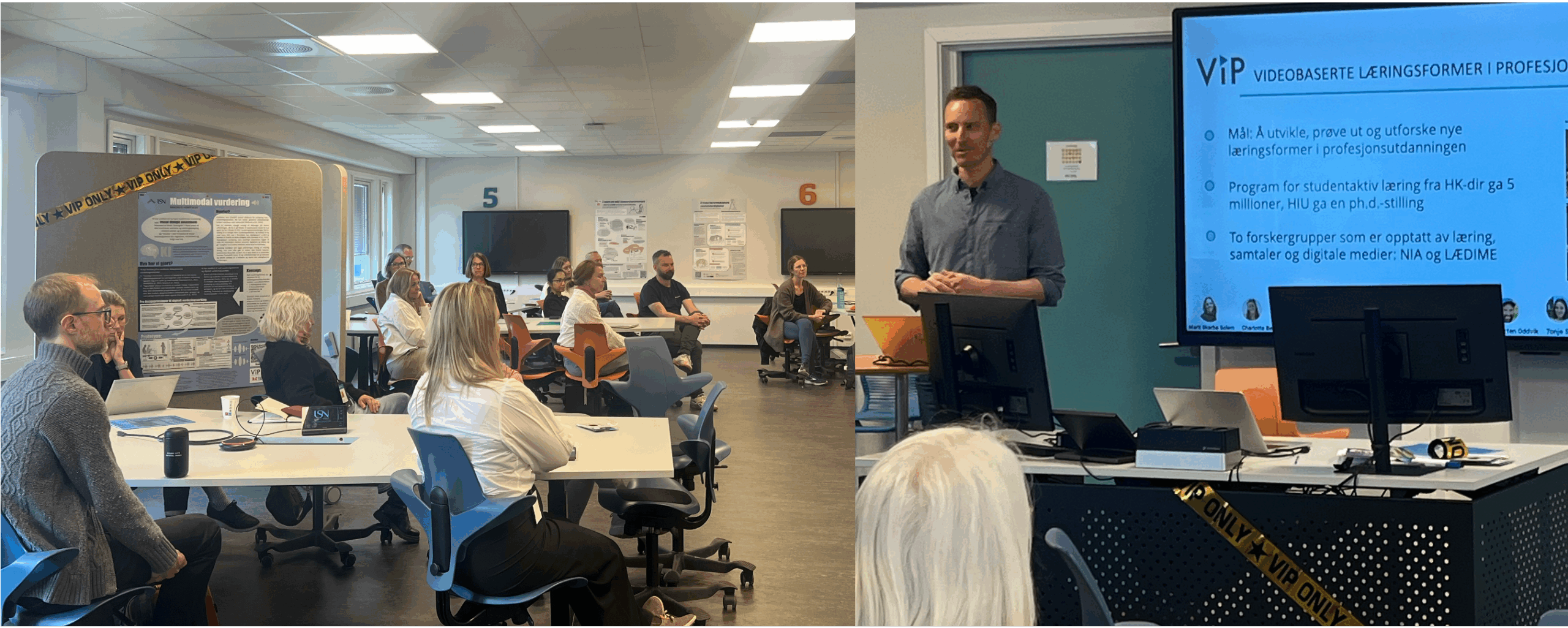 Vi utvikler og forsker på innovative læringsformer som møter sentrale utfordringer i profesjonsutdanningen. Gjennom dette arbeidet samarbeider vi med og formidler for studenter, lærere, undervisere, forskningsmiljøer og andre vitenskapelige ansatte. Bildet til venstre er fra et seminar der vi inviterte undervisere som var interessert i å prøve ut lignende arbeidsmåter til å komme for å lære mer.
